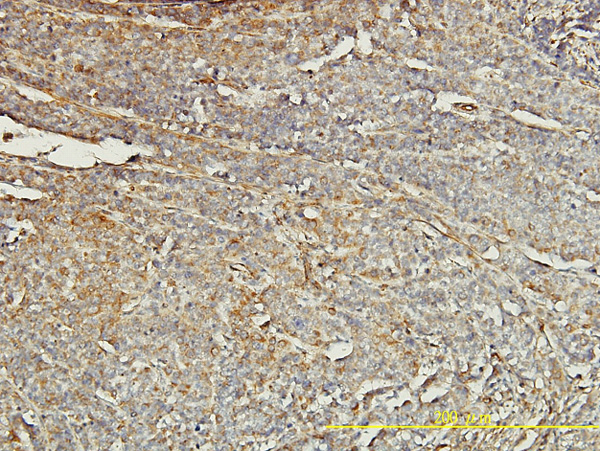 Immunoperoxidase of monoclonal antibody to TPM4 on formalin-fixed paraffin-embedded human transitional cell carcinoma tissue. [antibody concentration 2 ug/ml] |