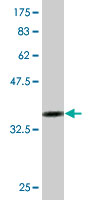 Western Blot analysis of TSSK1 expression in transfected 293T cell line by TSSK1 monoclonal antibody (M01), clone 4F12. Lane 1: TSSK1 transfected lysate(41.6 KDa). Lane 2: Non-transfected lysate.