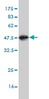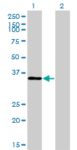 Western Blot analysis of TSTA3 expression in transfected 293T cell line by TSTA3 monoclonal antibody (M01), clone 2B9. Lane 1: TSTA3 transfected lysate(35.9 KDa). Lane 2: Non-transfected lysate. |