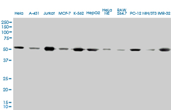 TUBA1 monoclonal antibody (M01), clone 2E11. Western Blot analysis of TUBA1 expression in different Cell lines and Human Tissue. |
