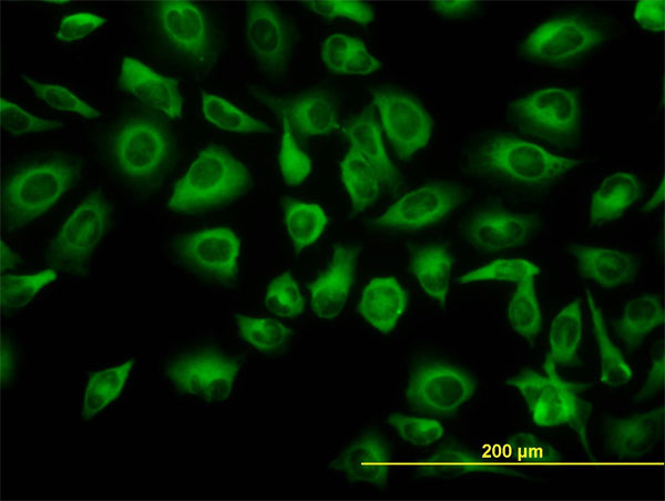 Immunofluorescence of monoclonal antibody to TUBA6 on HeLa cell. [antibody concentration 10 ug/ml] |