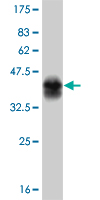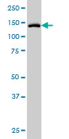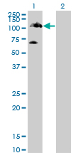 Western Blot analysis of TYK2 expression in transfected 293T cell line by TYK2 monoclonal antibody (M01), clone 6G12. Lane 1: TYK2 transfected lysate(133.7 KDa). Lane 2: Non-transfected lysate. |