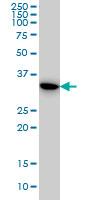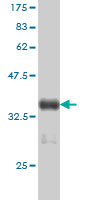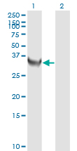 Western Blot analysis of TYMS expression in transfected 293T cell line by TYMS monoclonal antibody (M01), clone 3A1. Lane 1: TYMS transfected lysate(35.7 KDa). Lane 2: Non-transfected lysate. |