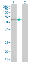 Western Blot analysis of ULK4 expression in transfected 293T cell line by ULK4 monoclonal antibody (M01), clone 4A10-1A7. Lane 1: ULK4 transfected lysate(65 KDa). Lane 2: Non-transfected lysate.