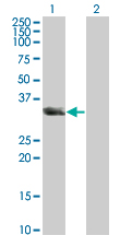Western Blot analysis of UNC119 expression in transfected 293T cell line by UNC119 monoclonal antibody (M01), clone 2F9-2A9. Lane 1: UNC119 transfected lysate(27 KDa). Lane 2: Non-transfected lysate.