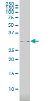 Western Blot analysis of USF1 expression in transfected 293T cell line by USF1 monoclonal antibody (M01), clone 3F6. Lane 1: USF1 transfected lysate(33.5 KDa). Lane 2: Non-transfected lysate. |
