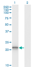 Western Blot analysis of VHL expression in transfected 293T cell line by VHL monoclonal antibody (M01), clone 1G12. Lane 1: VHL transfected lysate(19.7 KDa). Lane 2: Non-transfected lysate.