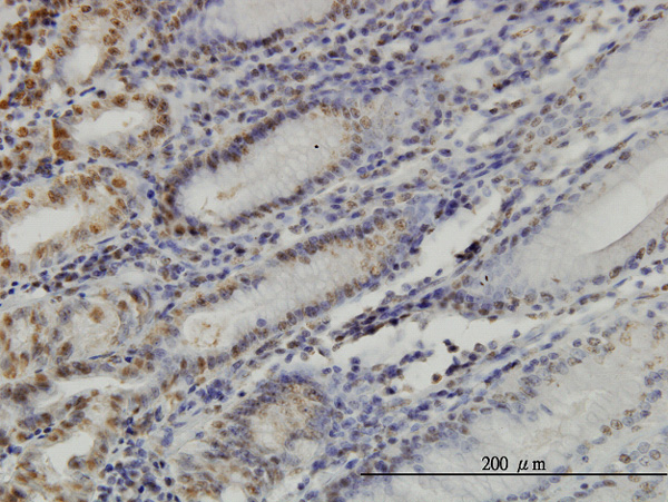 Immunoperoxidase of monoclonal antibody to YY1 on formalin-fixed paraffin-embedded human stomach. [antibody concentration 7 ug/ml] |