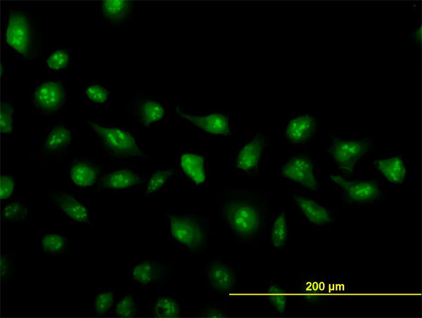 Immunofluorescence of monoclonal antibody to ZIC4 on HeLa cell. [antibody concentration 25 ug/ml] |