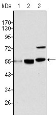 Figure 1: Western blot analysis using MYST1 mouse mAb against Hela (1), HepG2 (2) and SMMC-7721 (3) cell lysate.