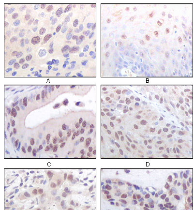 Figure 2: Immunohistochemical analysis of paraffin-embedded human esophageal squamous cell carcinoma (A), normal esophagus epithelium (B), rectum adenocarcinoma (C), lung squamous cell carcinoma (D), breast infiltrating carcinoma (E), and breast infiltrating carcinoma (F) tissues, showing nuclear localization using MOF/MYST1 mouse mAb with DAB staining.