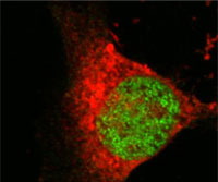 Figure 3: Confocal immunofluorescence analysis of Eca 109 cells using MOF/MYST1 mouse mAb (green), showing nuclear localization. |