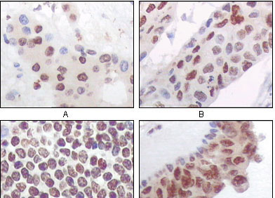 Figure 2: Immunohistochemical analysis of paraffin-embedded human liver carcinoma (A), esophagus carcinoma (B), normal spleen tissue(C), breast carcinoma (D), showing nuclear and cytoplasmic localization using PRAK mouse mAb with DAB staining. |