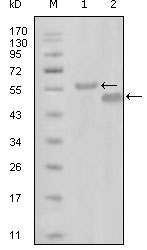 Figure 1: Western blot analysis using EphA6 mouse mAb against truncated MBP-EphA6 recombinant protein (1) and truncated GST-EphA6(aa695-795) recombinant protein (2).