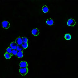 Figure 2: Confocal immunofluorescence analysis of HEK293 cells transfected with recombinant plasmid with human IgG Fc tag using human IgGFc mouse mAb (green). Blue: DRAQ5 fluorescent DNA dye. |