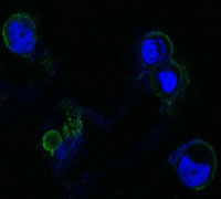 Figure 2: Confocal immunofluorescence analysis of methanol-fixed HEK293 cells trasfected with FGFR4-hIgGFc using FGFR4 mouse mAb(green), showing membrane localization. Blue: DRAQ5 fluorescent DNA dye.