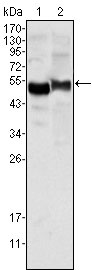 Figure 1: Western blot analysis using AAT mouse mAb against human plasma (1) and NIH/3T3 cell lysate (2). |
