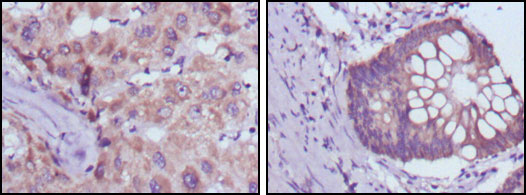Figure 3: Immunohistochemical analysis of paraffin-embedded human liver cancer (left) and colorectal cancer tissues (right) using BDH1 mouse mAb with DAB staining. |