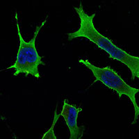 Figure 2: Immunofluorescence analysis of LOVO cells using Rab10 mouse mAb (green). Blue: DRAQ5 fluorescent DNA dye. |