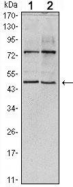 Figure 1: Western blot analysis using THAP11 mouse mAb against Hela (1) and NTERA-2 (2) cell lysate.