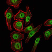 Figure 3: Immunofluorescence analysis of NTERA-2 cells using KDM4A mouse mAb (green). Red: Actin filaments have been labeled with Alexa Fluor-555 phalloidin. |