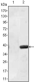Figure 1: Western blot analysis using MATN1 mAb against HEK293 (1) and MATN1(AA: 427-496)-hIgGFc transfected HEK293 (2) cell lysate.
