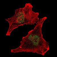 Figure 3: Immunofluorescence analysis of MCF-7 cells using SUZ12 mouse mAb (green). Red: Actin filaments have been labeled with Alexa Fluor-555 phalloidin. |