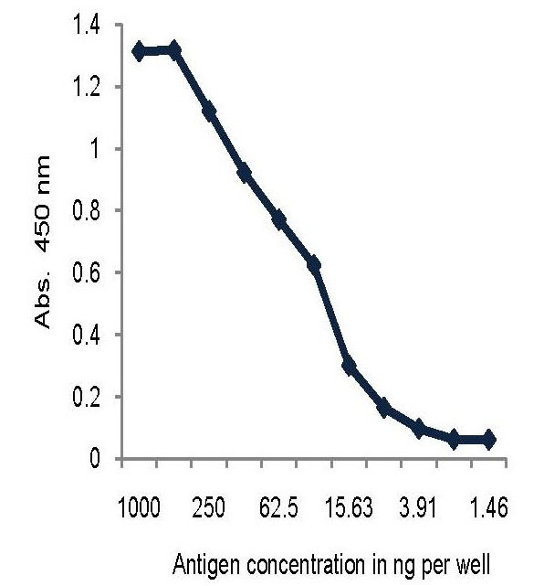Serial dilution of the recombinant insulin was done to check the affinity. The antibody used at 10 μg/ml can sensitively detect antigen up to 4 ng per well.