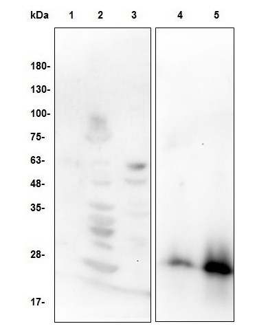 Western blot with CRP antibody: Lane 1: 60 μg Jurkat cell lysate; Lane 2: 44 μg mouse muscle lysate; Lane 3: 60 μg rat kidney lysate; Lane 4: 2 ng Recombinant human CRP; Lane 5: 10 ng Recombinant human CRP |