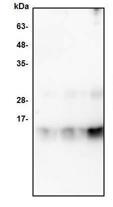 Western blot with SDF1 alpha antibody: Lane 1: 10 ng Recombinant mouse SDF1 alpha; Lane 2: 20 ng Recombinant mouse SDF1 alpha; Lane 3: 50 ng Recombinant mouse SDF1 alpha |