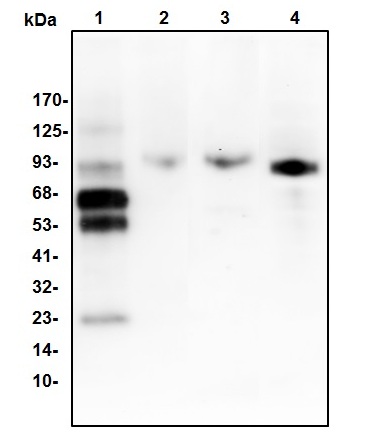 Western blot with human plasminogen antibody: lane1: human serum 2.6ug; lane2: Human Plasminogen 2ng; lane3: Human Plasminogen 10ng; lane4: Human Plasminogen 50ng. |