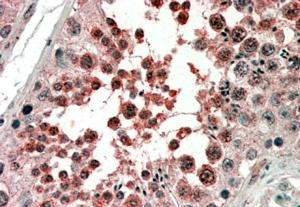 APR16199G (4 μg/ml) staining of paraffin embedded Human Testis. Steamed antigen retrieval with citrate buffer pH 6, AP-staining.