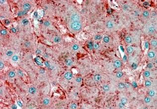 AMM04888G (2.5 μg/ml) staining of paraffin embedded Human Liver. Steamed antigen retrieval with citrate buffer pH 6, AP-staining.
