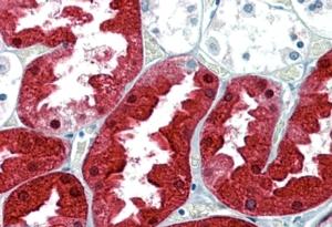 AMM04896G (2.5 μg/ml) staining of paraffin embedded Human Kidney. Steamed antigen retrieval with citrate buffer pH 6, AP-staining. |