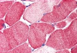 AMM04901G (5 μg/ml) staining of paraffin embedded Human Skeletal Muscle. Steamed antigen retrieval with citrate buffer pH 6, AP-staining. |