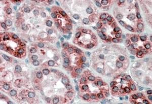 AMM05928G (3.8 μg/ml) staining of paraffin embedded Human Kidney. Steamed antigen retrieval with citrate buffer pH 6, AP-staining.