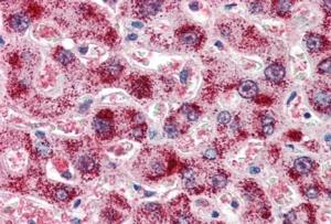 AMM04924G (2 μg/ml) staining of paraffin embedded Human Liver. Steamed antigen retrieval with citrate buffer pH 6, AP-staining.