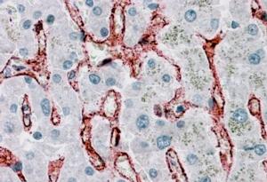 APR16248G (3.8 μg/ml) staining of paraffin embedded Human Liver. Steamed antigen retrieval with citrate buffer pH 6, AP-staining. |