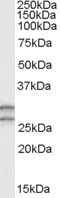 Staining of human testis lysate (35 μg protein in RIPA buffer) with AMRa00033G (0.3 μg/ml). Primary incubation was 1 hour. Detected by chemiluminescence. |