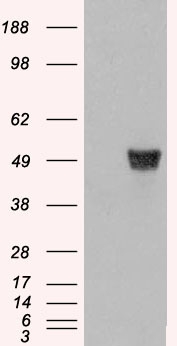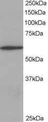 AF1965a staining (0.3 μg/ml) of Jurkat lysate (RIPA buffer, 35 μg total protein per lane). Primary incubated for 1 hour. Detected by western blot using chemiluminescence