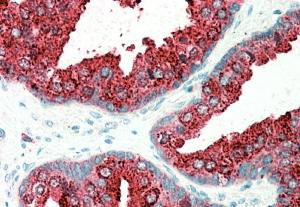 AMM04966G (5 μg/ml) staining of paraffin embedded Human Prostate. Steamed antigen retrieval with citrate buffer pH 6, AP-staining. |