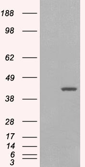 APR16296G staining (0.03 μg/ml) of human HeLa cell lysate (RIPA buffer, 35 μg total protein per lane). Primary incubated for 1 hour. Detected by western blot using chemiluminescence.