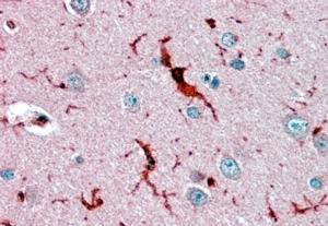 AMM04993G (3.8 μg/ml) staining of paraffin embedded Human Cerebral Cortex. Steamed antigen retrieval with citrate buffer pH 6, AP-staining. |