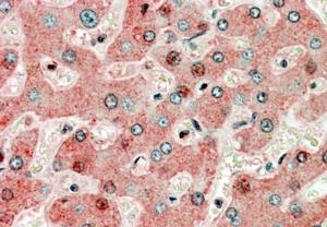 AMM05001G (3.8 μg/ml) staining of paraffin embedded Human Liver. Steamed antigen retrieval with citrate buffer pH 6, AP-staining. |