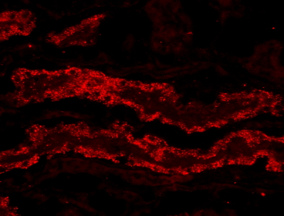 AMM05002G (20 μg/ml) staining of PFA-perfused cryosection of Porcin Kidney. Microwave antigen retrieval with citrate buffer pH 3, CY3-staining. Data obtained from Dr. Hrvoje Brzica, University of Zagreb, Croatia |
