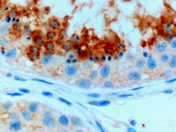APR07126G (0.3 μg/ml) staining of paraffin embedded Human Testis. Microwaved antigen retrieval with citrate buffer pH 6, HRP-staining. |
