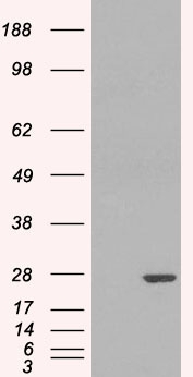 HEK293 overexpressing GSTP1 (RC203086) and probed with AMM05004G (mock transfection in first lane), tested by Origene. |