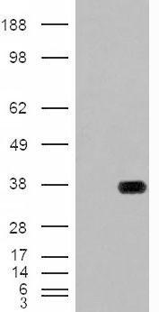 AMM05006G (0.02 μg/ml) staining of Human Kidney lysate (35 μg protein in RIPA buffer). Primary incubation was 1 hour. Detected by chemiluminescence.