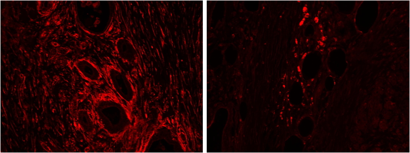 AMM05013G (2 μg/ml) staining of paraffin embedded Human Pancreas: cancer (left), adjacent to cancer (right). Steamed antigen retrieval with citrate buffer pH 6, Alexa594-staining.