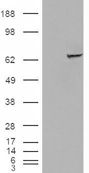 AMM05020G (1 μg/ml) staining of HepG2 cell lysate (35 μg protein in RIPA buffer). Primary incubation was 1 hour. Detected by chemiluminescence.